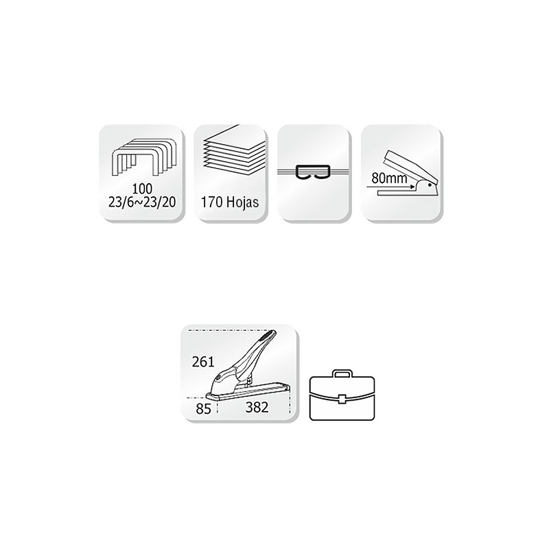 Base antideslizante para evitar arañazos en el escritorio. Guía de ajuste de papel con bloqueo. Guía de ajuste de papel con bloqueo. Yunque giratorio para diferentes tipos de grapas. Indicador de recarga. Compartimento de almacenamiento de grapas.