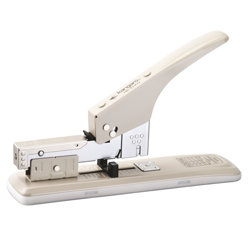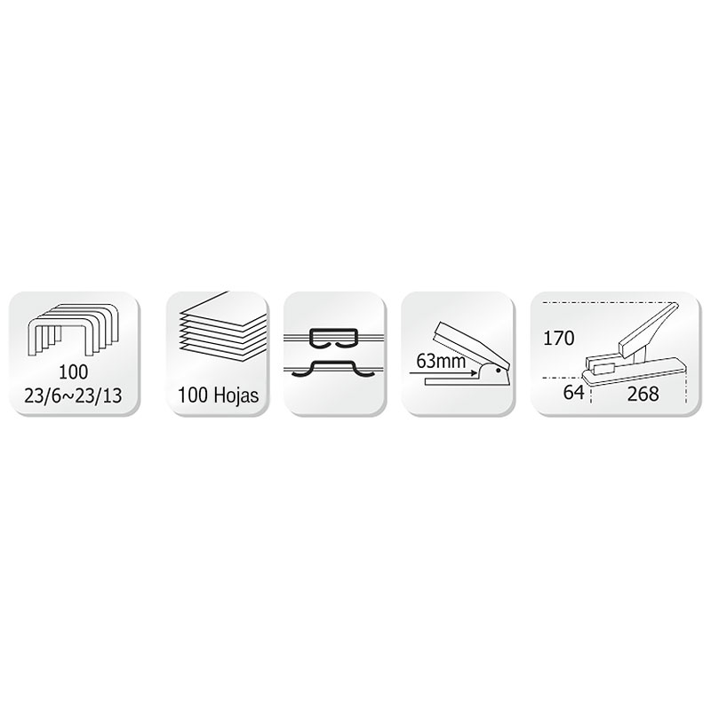 Grapadora de gruesos metálica. Base de goma antideslizante para evitar arañazos en el escritorio. Guía de papel ajustable, puede ser usada para desatascos. Carga trasera de grapas. Yunque giratorio.