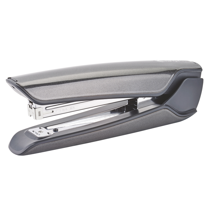 Grapadora metálica de tira completa, con cuerpo de plástico de alta calidad y con diseño ergonómico. Mecanismo de carga rápida.