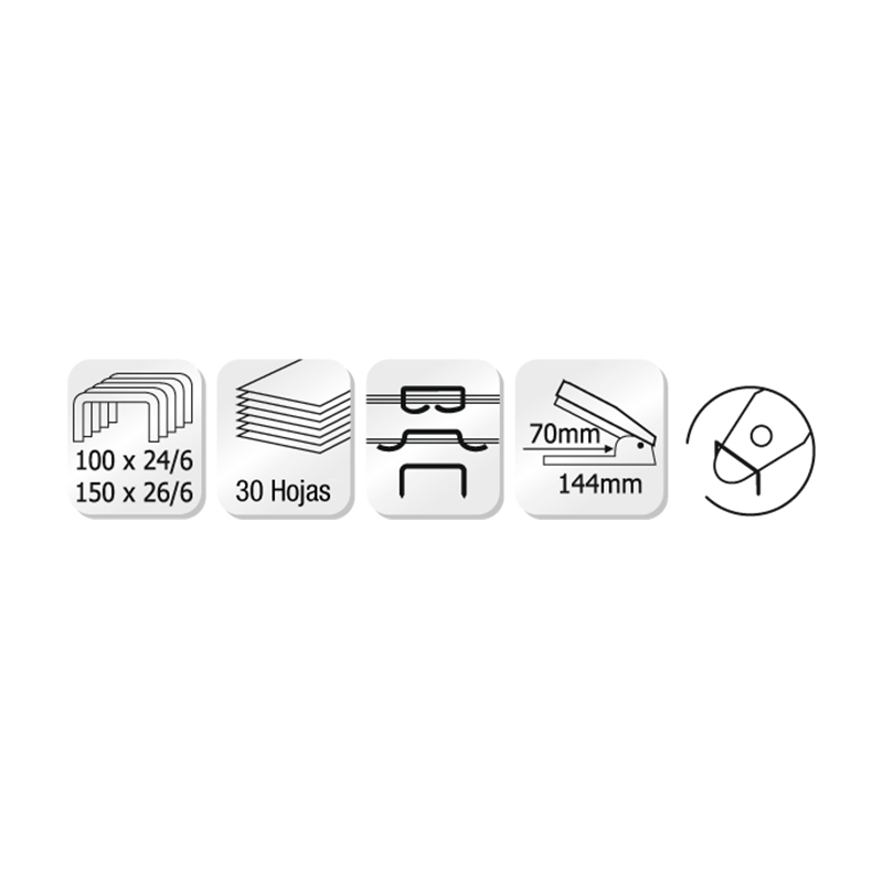 diseño ergonómico. Mecanismo de carga rápida. Yunque giratorio. Extraegrapas incorporado con soporte para grapas.